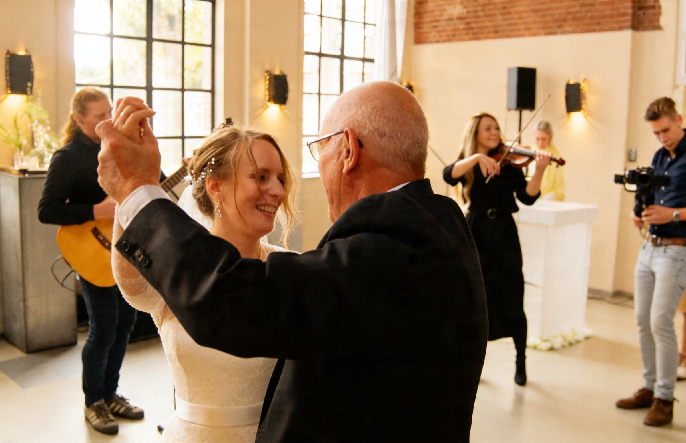 bruid danst met vader tijdens Ierse bruiloft met live muziek door Maarten met violiste Danielle